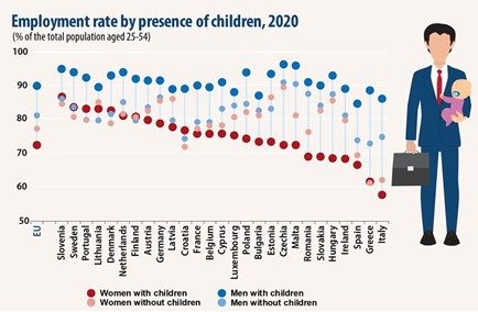 Va sottolineato inoltre come questo divario si aggravi se consideriamo il tasso di occupazione per genere in presenza di figli. Mediamente in Europa si riscontra infatti come siano proprio i padri a lavorare di più anche rispetto agli uomini senza figli, mentre per le donne vale il contrario, a conferma dell’abitudine culturale radicata di pensare all’uomo di famiglia come unico percettore di reddito ed alla donna come colei che si prende cura di casa e figli.